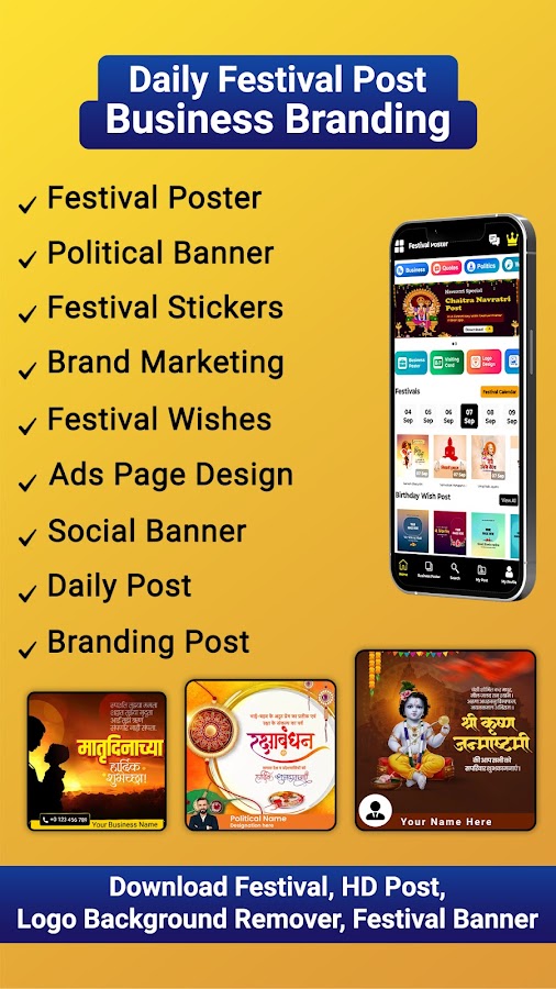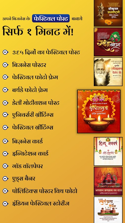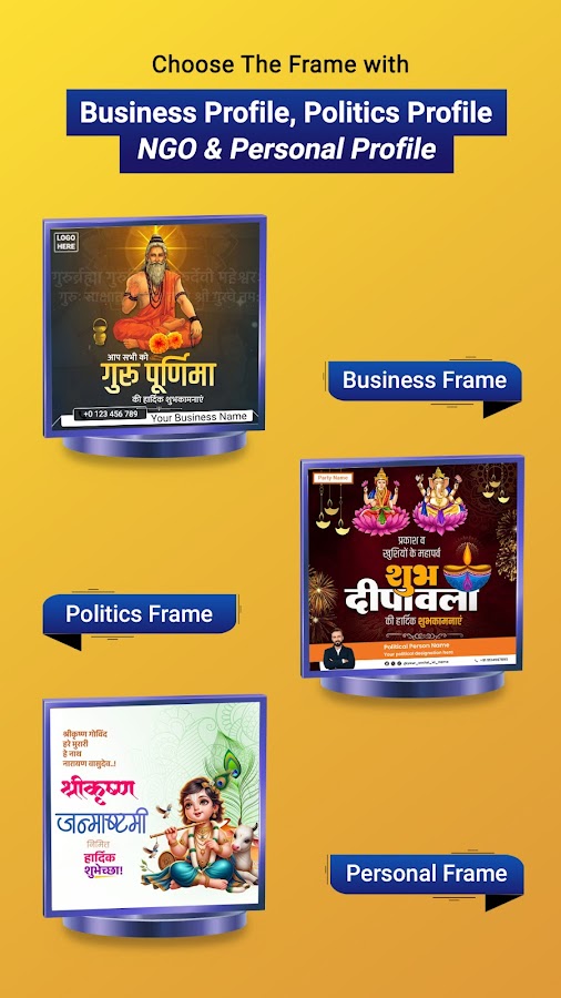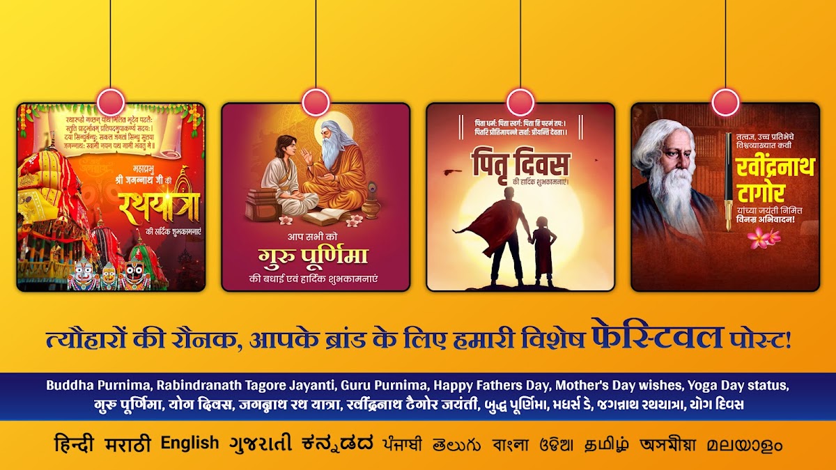 With the Festival Poster Maker you don’t need a designer to create a professional business poster, फेस्टिवल पोस्ट, political post, festival photo frames, business branding post, ads banner, politics poster with photo, political frame and social banner with 10+ Regional languages Hindi, Marathi, English, Gujrati, Tamil, Telugu, Bengali and more.