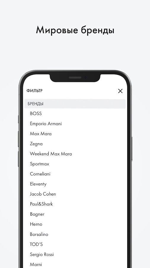 В приложении представлен широкий выбор мировых брендов: Dolche&Gabbana, Kiton, Max Mara, Zegna, Corneliani, Canali, Bogner, BOSS, HUGO, Emporio Armani, Max&Co, Furla, Pinko, Coccinelle, Wolford, и многие другие.
