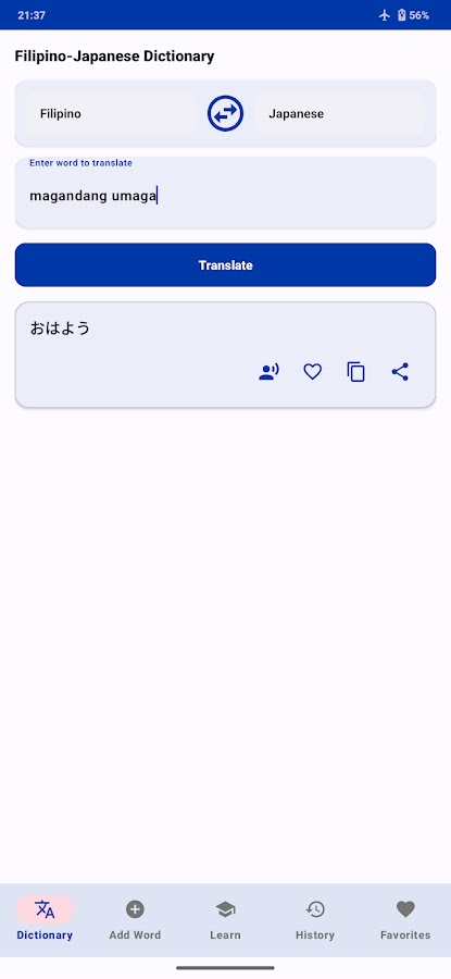 Филиппинский (тагальский) японский словарь не только переводит отдельные слова, но и целые предложения, а также имеет функцию голосового перевода для упрощения произношения. Результаты также читаются фонетически, и вы можете поделиться результатами перевода в различных социальных сетях.