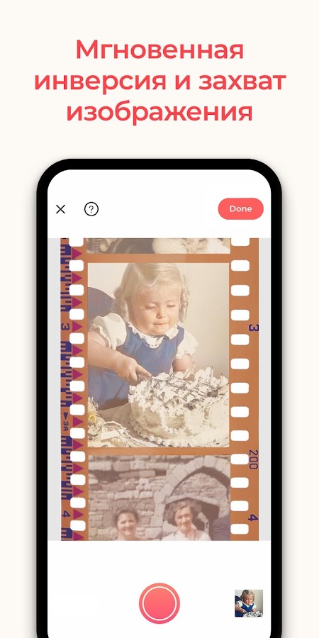 Интеллектуальный алгоритм приложения автоматически инвертирует цвета и обрабатывает изображение, обеспечивая максимально возможное качество, которое можно получить из старого негатива.