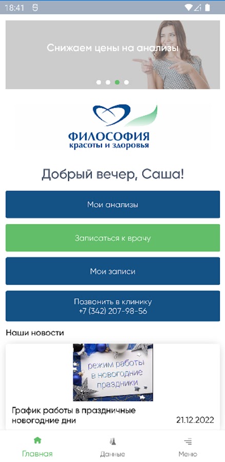 Приложение для клиентов медицинского центра «Философия красоты и здоровья».