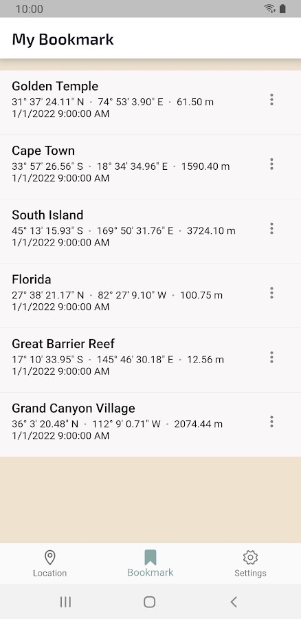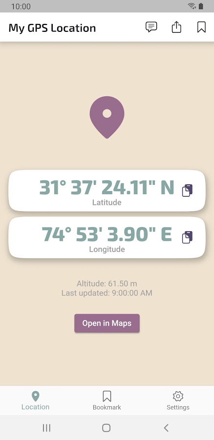 Проверьте GPS-координаты и высоту вашего текущего местоположения. Коснитесь широты и долготы, чтобы скопировать их и вставить в другое место. Вы можете проверить свое текущее местоположение и сохраненные местоположения в приложении «Карты». Вы также можете поделиться своим местоположением с людьми, которых вы знаете, с помощью кнопки SMS и кнопки «Поделиться». Если вы используете функцию закладок, вы можете сохранить текущее местоположение с именем, и оно будет записано на вкладке закладок. На вкладке «Закладки» вы можете увидеть историю посещений. В настройках приложения вы можете выбрать, отображать ли формат местоположения в формате DMS или формате DD. Вы можете выбрать метр, ярд или фут в качестве единицы измерения расстояния.