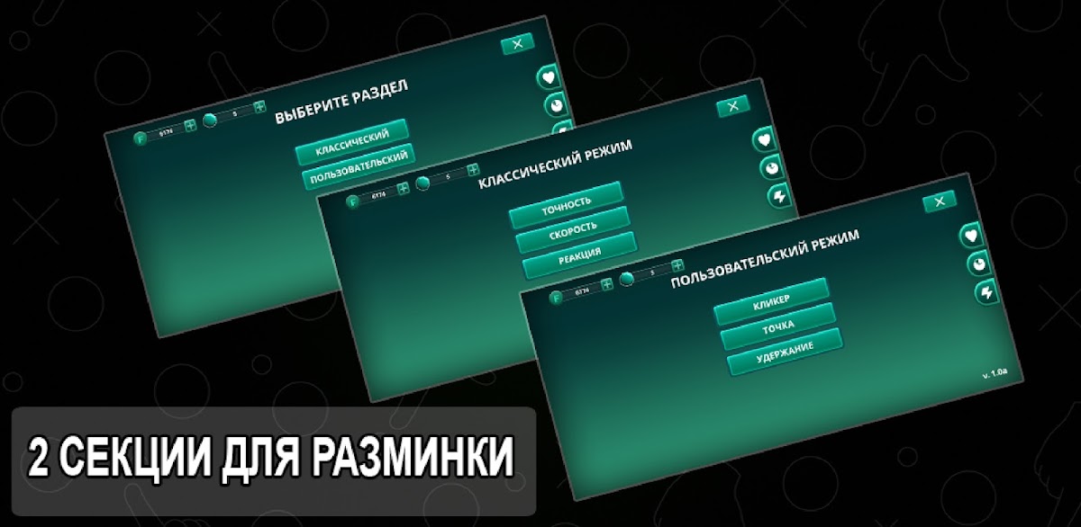Данное приложение поможет вам усовершенствовать навыки для комфортной игры, достижению призовых мест в PUBG, Free Fire, Standoff и др. Ежедневные тренировки помогут вам забыть, что такое не успеть нажать на нужную кнопку или вовремя не среагировать в поединке с другими игроками. Также со временем ваша реакция, скорость, точность и внимание будут улучшаться, но для этого необходимо тренироваться, и это приложение то, что вам нужно!