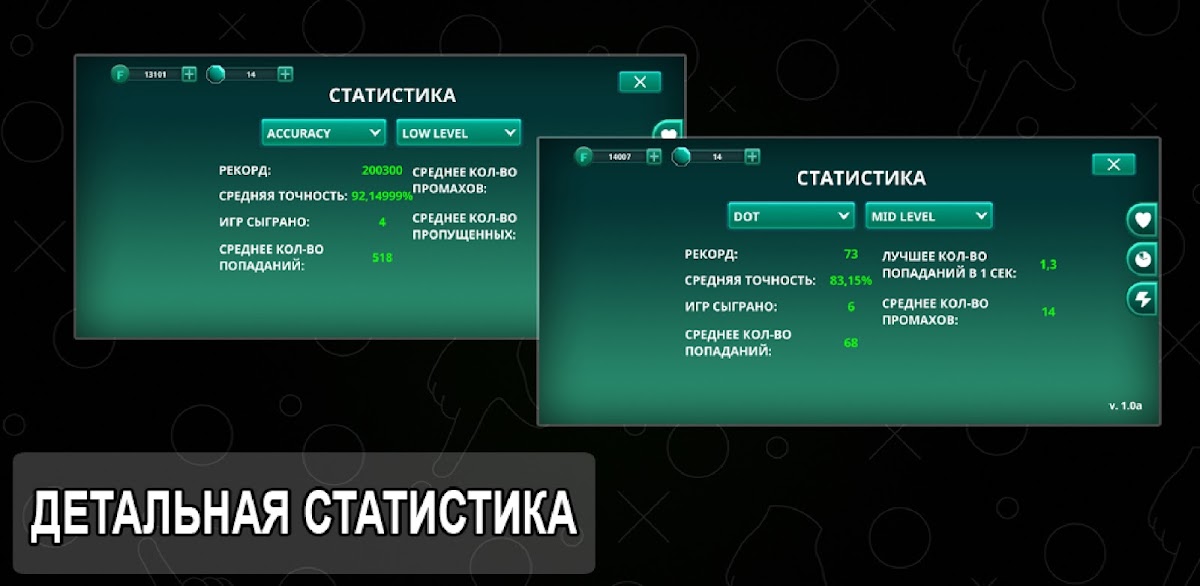 • Две взаимосвязанных секции, каждая из которых направлена на тренировку прицельной точности, скорости и реакции.