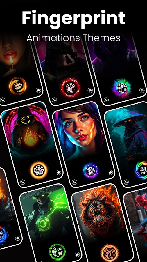 Настройте процесс разблокировки телефона с помощью функции Fingerprint Neon Live Animation. Попрощайтесь со скучными экранами блокировки и наслаждайтесь красочными темами отпечатков пальцев. Выбирайте из множества обоев с анимацией отпечатков пальцев, включая неоновые цвета, темы отпечатков пальцев 4K и живые эффекты экрана блокировки. С помощью эффекта анимации отпечатков пальцев вы можете выбрать и применить любимую живую анимацию отпечатков пальцев всего одним касанием.
