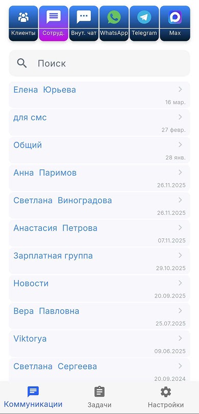 В одном месте доступна переписка по WhatsApp, Telegram, Внутренние чаты. Совсем скоро появится Max