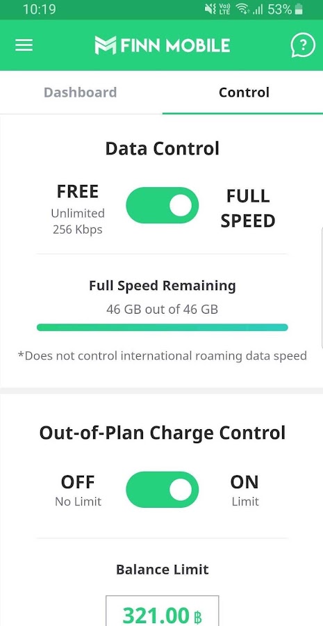 Управлять своими расходами еще никогда не было так просто. Проверьте свой непогашенный остаток прямо на приборной панели и установите предел для ваших внеплановых расходов с помощью нашего переключателя контроля надбавки за пакет. Хотите использовать больше? Не проблема. Обновите свой пакет, когда захотите, или купите топпинг в главном меню.