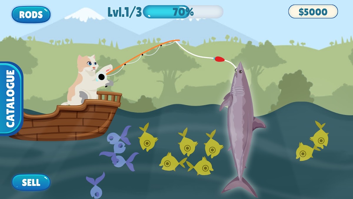 Симулятор рыбалки для кошек предлагает рыбалку для кошек, чтобы наблюдать за огромным разнообразием видов рыб, улучшения для удочек для подледной рыбалки, улучшения для катушки и длины лески удилища, а также конкретную награду за вытаскивание рыбы из воды. Для ловли рыбы погрузитесь в расслабляющие места для ловли кошек. Рыба в игре о ловле рыбы продается исключительно котом-рыболовом. Эта игра о рыбалке для кошек так снимает стресс, что она обеспечивает захватывающее ощущение рыболовного тура, когда кошка идет на рыбалку.