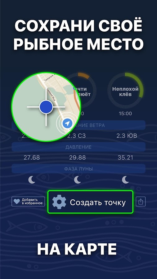 Сохрани любые рыбацкие точки и посмотри прогноз клёва именно для них. Реальная рыбалка.