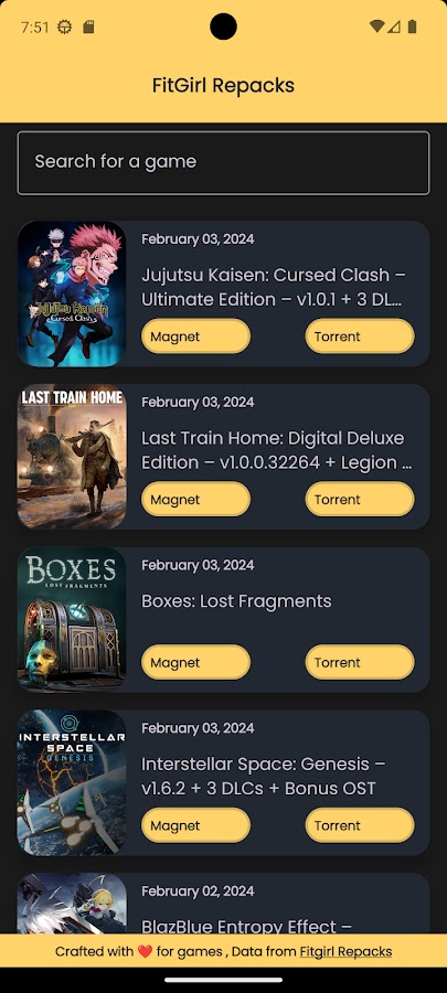 Это приложение обновляет последние данные с сайта репаков Fitgirl 3 раза в день и также имеет доступ к поиску по всей коллекции репаков fitgirl.