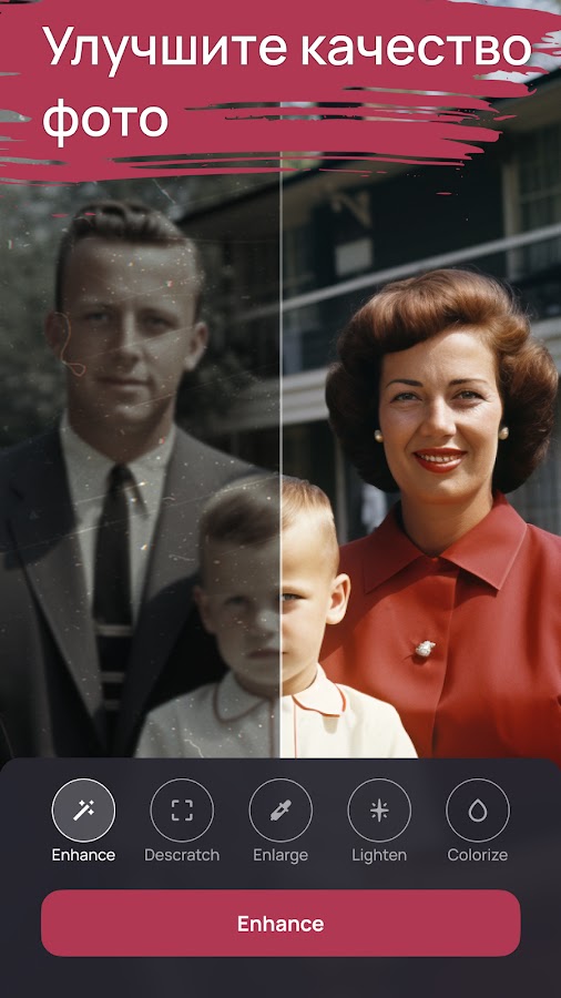 Рестоврация старых фото: Восстановите даже самые старые и поврежденные фотографии. Наши передовые алгоритмы позволяют устранить повреждения и восстановить детали, чтобы ваше фото снова стало ярким и четким.