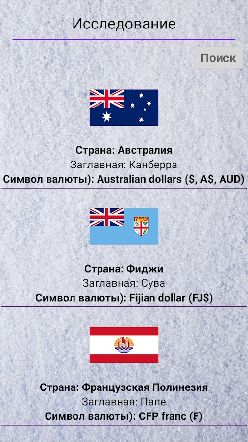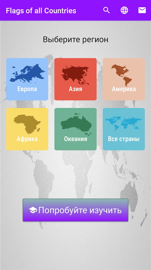 Теперь вы узнаете флаги всех стран с названием, столицей и валютой независимо для каждого региона, включая Европу, Азию, Африку, Америку и другие континенты.
