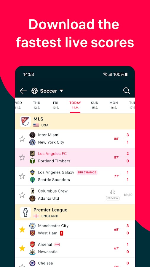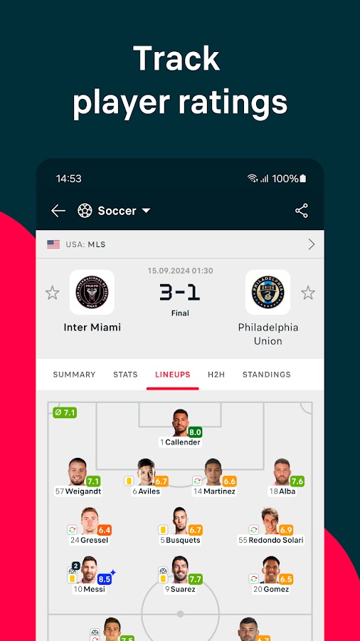 ⏱️ Самые быстрые результаты в режиме реального времени: получайте обновления в режиме реального времени с подробной статистикой, данными xG, уникальными рейтингами игроков и команд, текущими турнирными таблицами и обновлениями матчей.