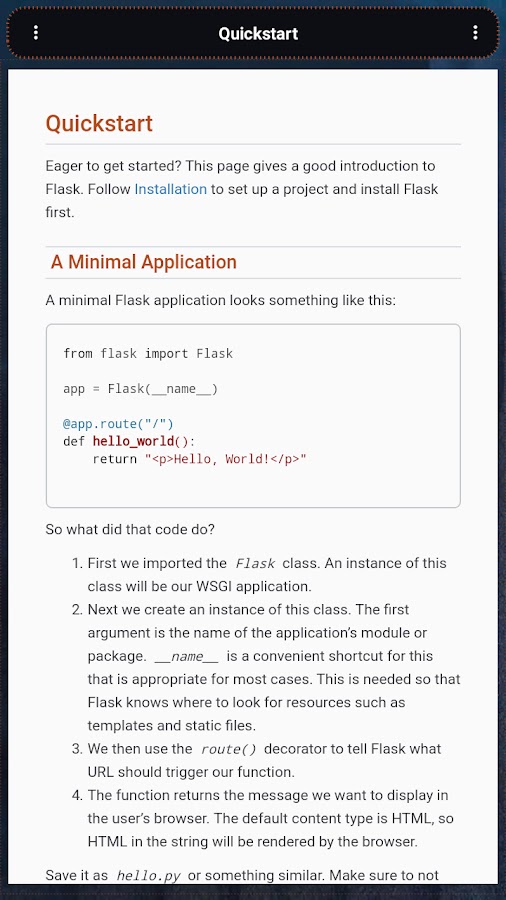 Это приложение, которое позволяет вам изучить веб-приложение Flask от начала до конца в автономном режиме. Flask — это микровеб-фреймворк, написанный на Python. Он классифицируется как микрофреймворк, поскольку не требует специальных инструментов или библиотек. Он не имеет уровня абстракции базы данных, проверки формы или каких-либо других компонентов, в которых уже существующие сторонние библиотеки предоставляют общие функции.