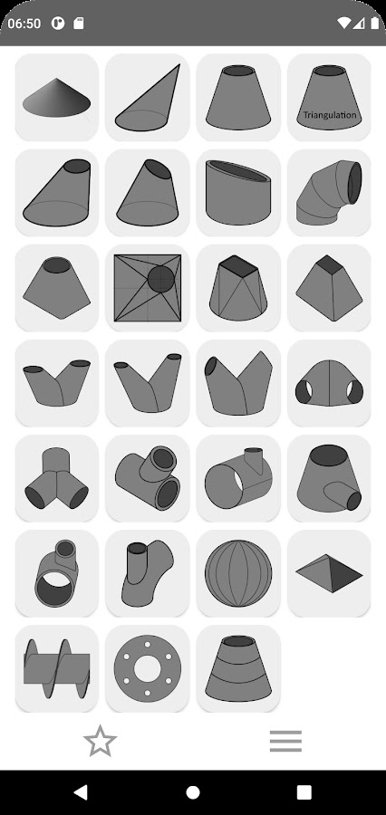Калькулятор поможет рассчитать размеры необходимые для раскроя листового материала и изготовить : конус, отвод ( изгиб, колено) , тройник, врезку трубы в трубу под углом, сегмент шнека, переход от круга к прямоугольнику, переход с прямоугольника на прямоугольник, переход с прямоугольника на круг с смещением, усечённый конус, усечённый конус с смещением, врезку трубы в конус.
