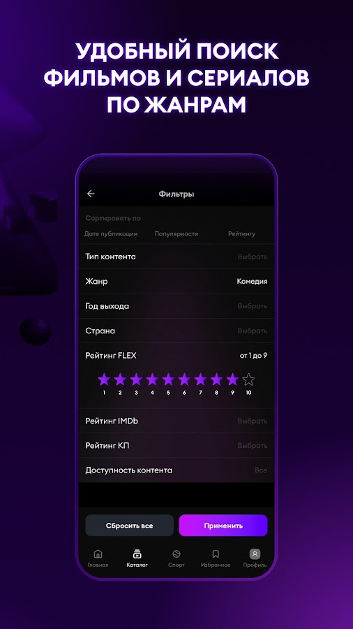 Удобный интерфейс и подборки по жанрам помогают быстро выбрать фильм или сериал на вечер: комедии, боевики, триллеры, фантастика, мелодрамы, детективы, аниме и документальные фильмы.