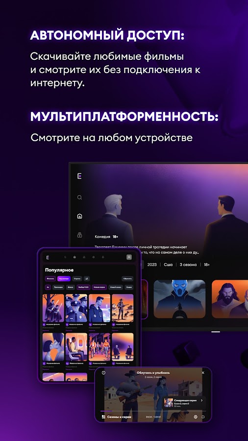 В приложении собраны популярные фильмы, культовые сериалы, мировые премьеры и подборки по жанрам. Удобная навигация и быстрый поиск помогают легко найти фильм или сериал под настроение.