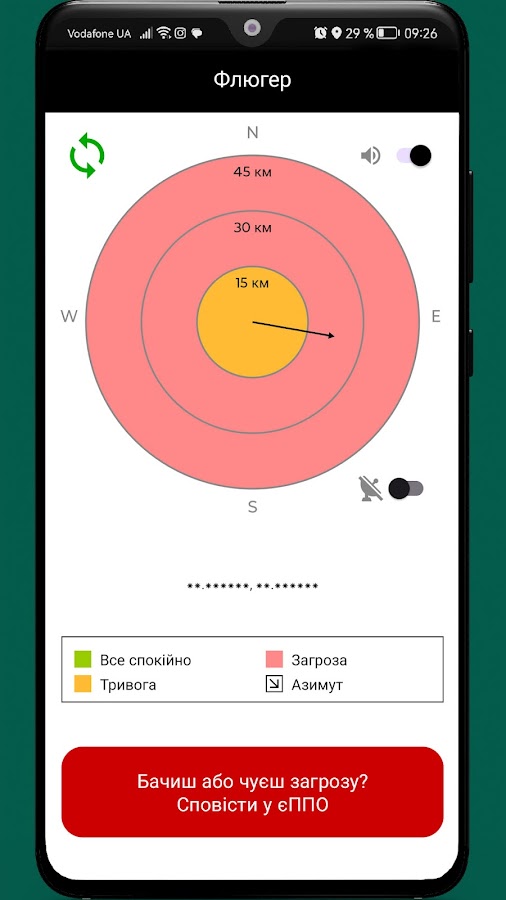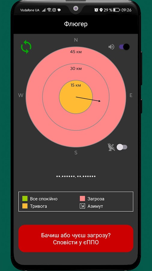 Флюгер – это простое и эффективное приложение, которое помогает мгновенно оценить воздушную ситуацию. Без лишних деталей только важнейшая информация: направление угроз и их расстояние в радиусах.