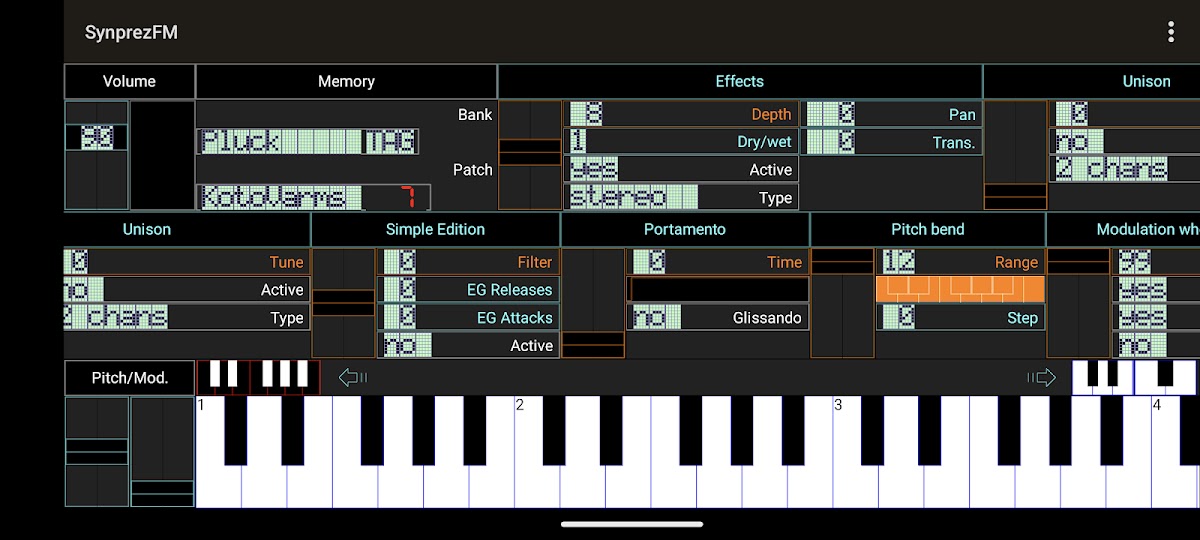 Чтобы расширить поле экспериметов, SynprezFM 2 также является эмулятором Yamaha DX7, который может с точностью воспроизводить sysex файлы загруженные во внешнее хранилище указанное в меню. Вы также можете создавать и сохранять собственные звуки, либо путем редактирования встроенных звуков, либо начать запись с нуля используя ‘init voice’ функцию.
