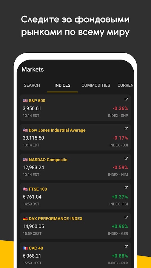 Следуйте основным мировым индексам в США (США), Америке, Европе, Азии, Тихоокеанском регионе, Африке и на Ближнем Востоке, в том числе: S&P 500, Dow Jones, NASDAQ, NYSE, Cboe UK 100, Russell 2000, CBOE, VIX, FTSE 100, DAX, CAC 40, ESTX 50, EURONEXT 100, BEL 20, IBEX 35, MOEX, Nikkei, Hang Seng, SSE Composite Index, Shenzen Component, STI, S&P ASX 200, ALL ORDINARIES, S&P BSE SENSEX, Jakarta Composite Index, FTSE Bursa Malaysia KLCI, S&P NZX 50, KOSPI, TSEC, TSX, IBOVESPA, IPC MEXICO, S&P IPSA, MERVAL, TA-125, EGX 30, TOP 40 USD Net TRI Index.