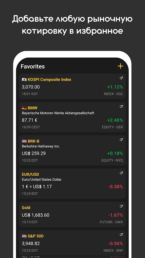 Добавьте свои любимые акции и их авуары в свое персонализированное портфолио. Добавляйте любые финансовые инструменты в свой собственный список наблюдения.