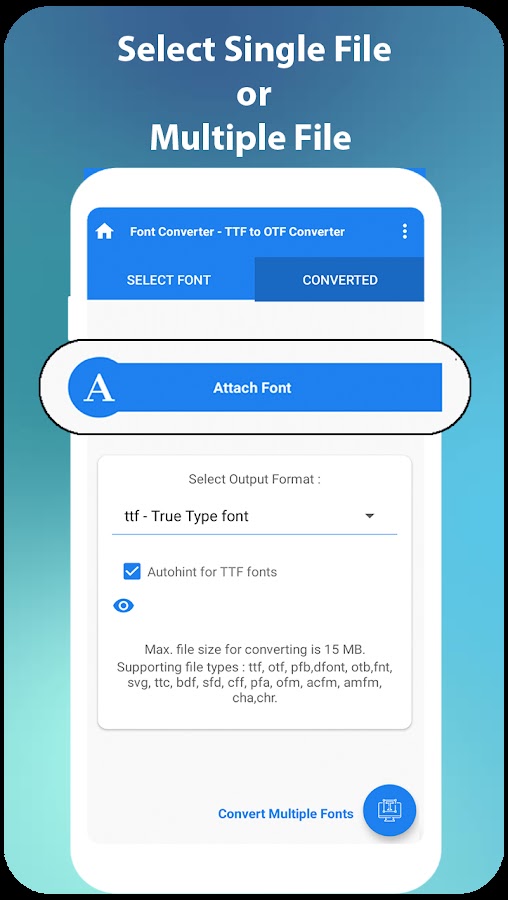 Конвертер файлов шрифтов и средство просмотра файлов шрифтов предназначены для простого преобразования файлов ttf в файлы otf или любого другого формата, а также для предварительного просмотра шрифта, вы можете легко просмотреть TTF, OTF и другие шрифты. Приложение для преобразования шрифтов для Android предоставляет пользователю другой инструмент для преобразования файла шрифта в желаемый файл шрифта и легкого просмотра шрифта, поэтому наш конвертер шрифтов — лучшее приложение для преобразования вашего шрифта ttf в otf и шрифта otf в другой другой формат. шрифт, легкое преобразование шрифтов и просмотрщик шрифтов во многие другие шрифты по вашему выбору и тому, что вам нравится. Итак, давайте выберем ваш текстовый файл и преобразуем его в выбранный вами шрифт и почувствуем себя легко, как сменщик шрифтов.