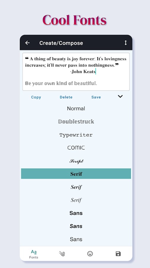 Вы можете изучить обширную библиотеку необычных шрифтов с помощью приложения Stylish Text Fonts. Выбирайте классические, современные, необычные и необычные шрифты, соответствующие вашему настроению или теме. Независимо от того, создаете ли вы графику или отправляете персонализированное сообщение, Fancy Fonts Art сделает ваши сообщения визуально привлекательными.