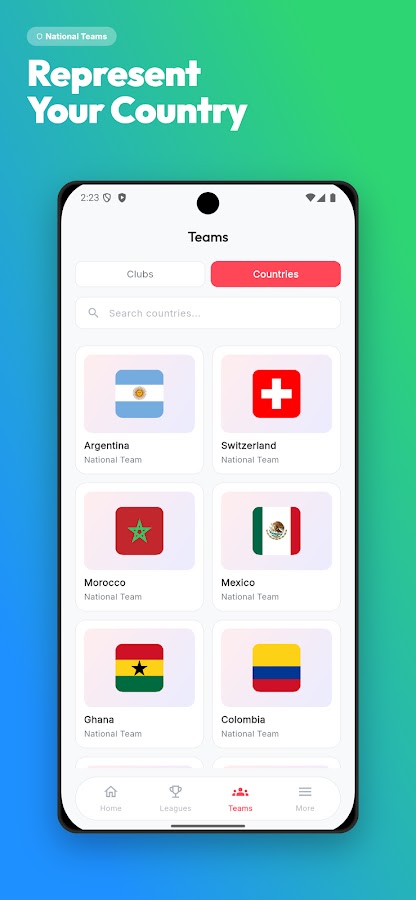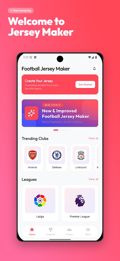 Приложение для создания футболок дает вам возможность выбирать между клубами из таких лиг, как Лалига, Лига чемпионов, Бундеслига, Серия А, Лига 1. Кроме того, перечислены все страны, которые участвуют в чемпионате мира по футболу FIFA 2022, и вы можете дизайнерский трикотаж любимой страны.
