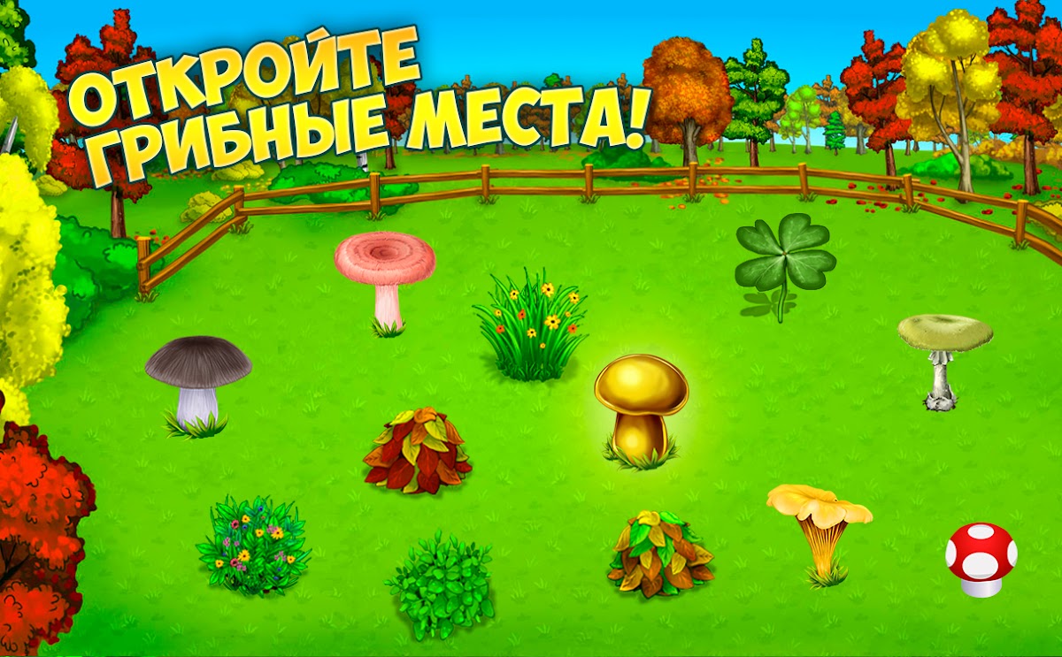 КРАСОЧНЫЙ ЛЕС полон самых разных грибов – от знакомых с детства до редких и малоизвестных. Так что скорее берите корзинку и айда по грибы! Собирайте грибочки, готовьте из них всякие вкусности, обустраивайте и украшайте деревушку и ферму по своему вкусу.