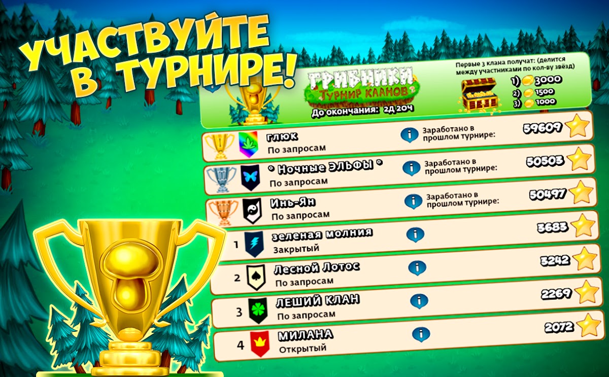 – Вступите в клан или создайте свой, общайтесь в чате и помогайте друг другу грибами, принимайте участие в турнире и получайте золотую награду
