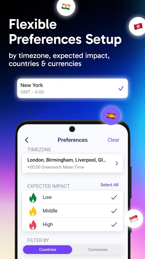 Tailor your forex calendar experience precisely to match interests with setting up filters by time zone, base currencies, countries, and expected event impact.
