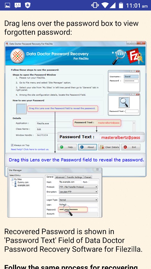 Приложение советует пароль разоблачать и Reveal шаги, чтобы преобразовать пароль, скрытый за звездочками или точками с использованием соответствующих данных Доктор Password Recovery программного обеспечения для Windows. Данные доктор Password Recovery Software выявляет сохраненные пароли от всех типов электронных писем, настроенных во всех видах сообщений электронной почты всех типов веб-сайтов, а также популярных почтовых сервисов, таких как Gmail Hotmail прогноз Yahoo AOL и т.д., независимо, настроенные SMTP POP3 или IMAP на основе настроек над SSL TSL или стандартные параметры проверки подлинности.