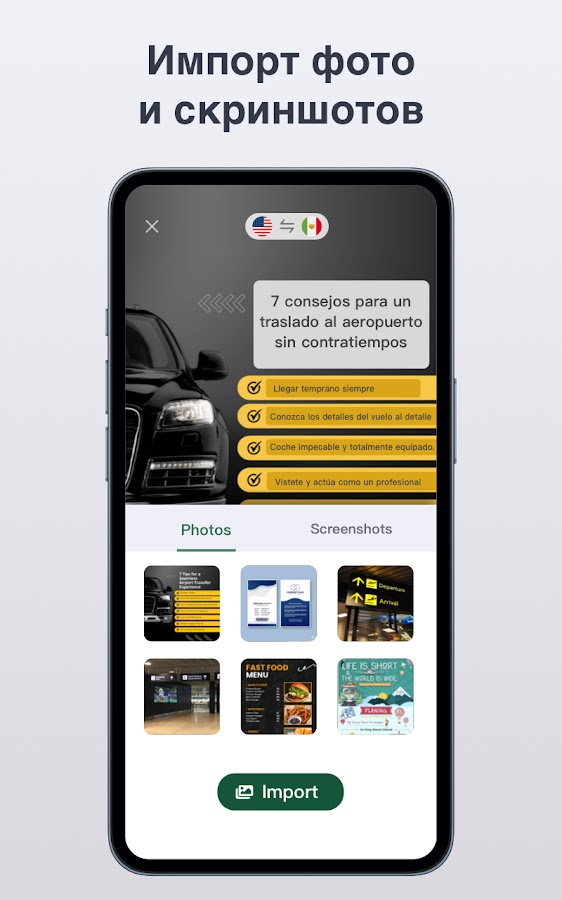 ✔️ Фото-переводчик (OCR): импортируйте фото и скриншоты, распознавайте и переводите текст быстро