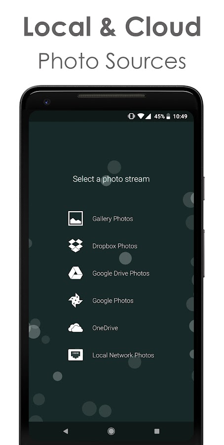 Вы можете беспрепятственно передавать свои фотографии из локальной фотогалереи и облачных сервисов, таких как Google Фото, Dropbox, Google Drive, Microsoft OneDrive, локальная сеть (Samba / SMB) и многие другие!