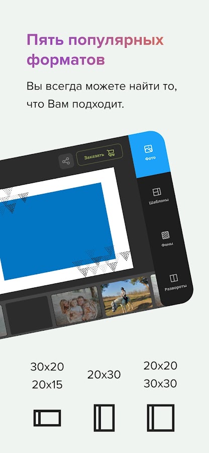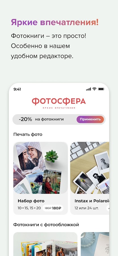С Фотосферой ваши воспоминания превращаются в стильные фотокниги, постеры, фото на мольберте и снимки в стиле Instax и Polaroid. Создавайте уникальные фотопродукты легко и быстро благодаря интуитивному интерфейсу и профессиональному качеству печати.