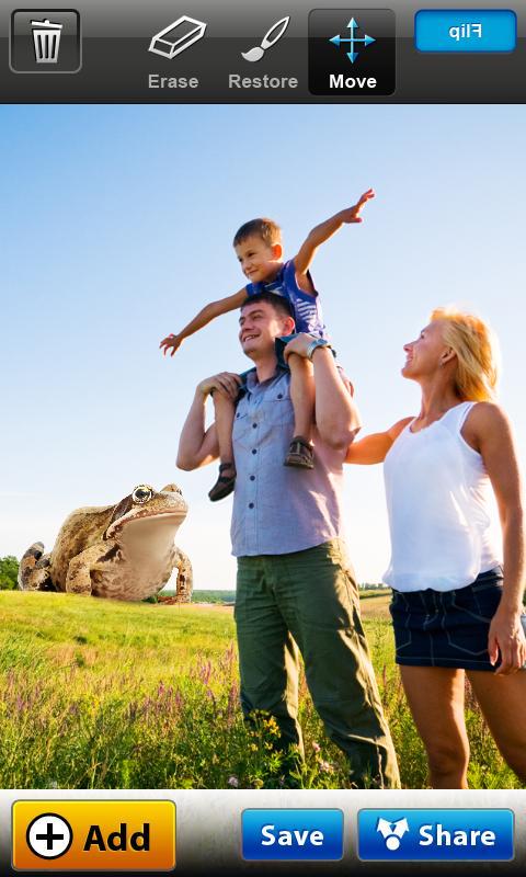 Вы можете масштабировать, вращать стикер и даже поставить его за объект на вашей фотографии, используя инструмент Ластик.