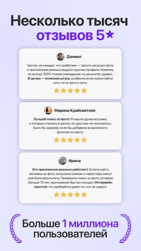 Скорее устанавливайте приложение и начните поиск людей по фото без ограничений. Ищите друзей, подруг и старых знакомых. У нас вы без труда найдете школьных друзей и сможете убедиться, что они менее успешные, чем вы – сын маминой подруги. Найти людей по их лицу никогда не было так просто, как сейчас, или даже увидеть своего двойника! Это ваш личный шерлок в мире цифровых технологий, словно умная камера или search face! Скорее пробуйте бесплатно!