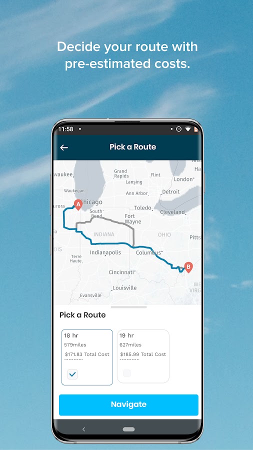 Вы также можете загружать документы, сообщать о наличии грузовиков и получать доступ к специальной пошаговой навигации для грузовиков с подробной информацией о стоимости топлива по различным вариантам маршрута.