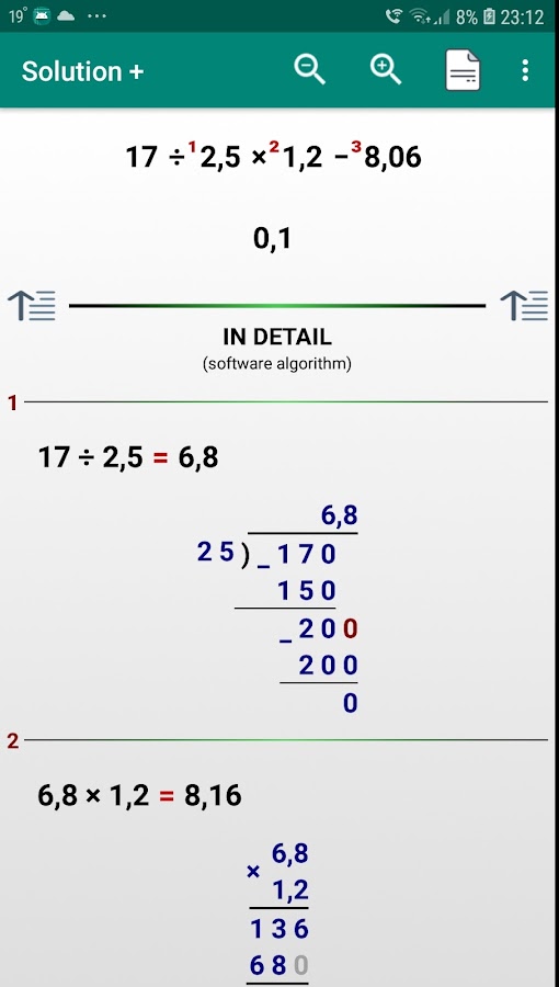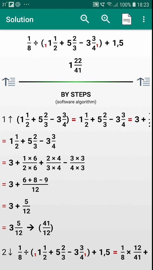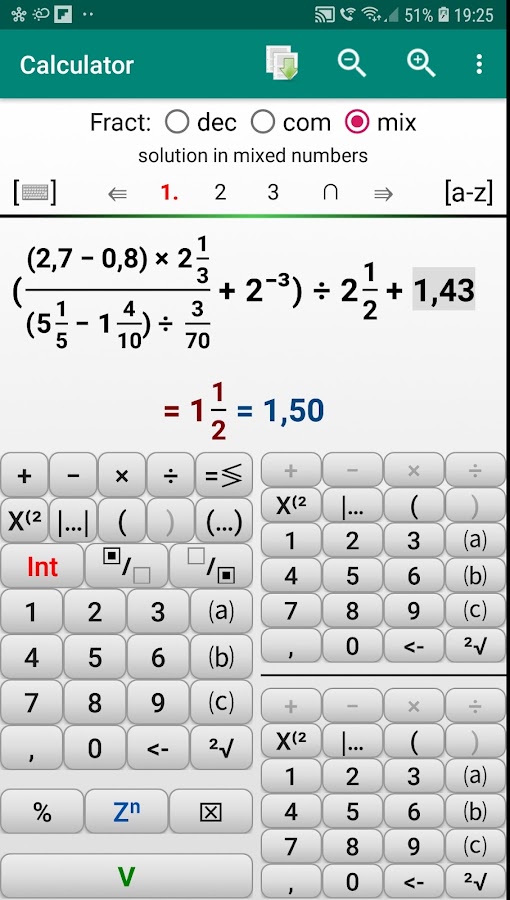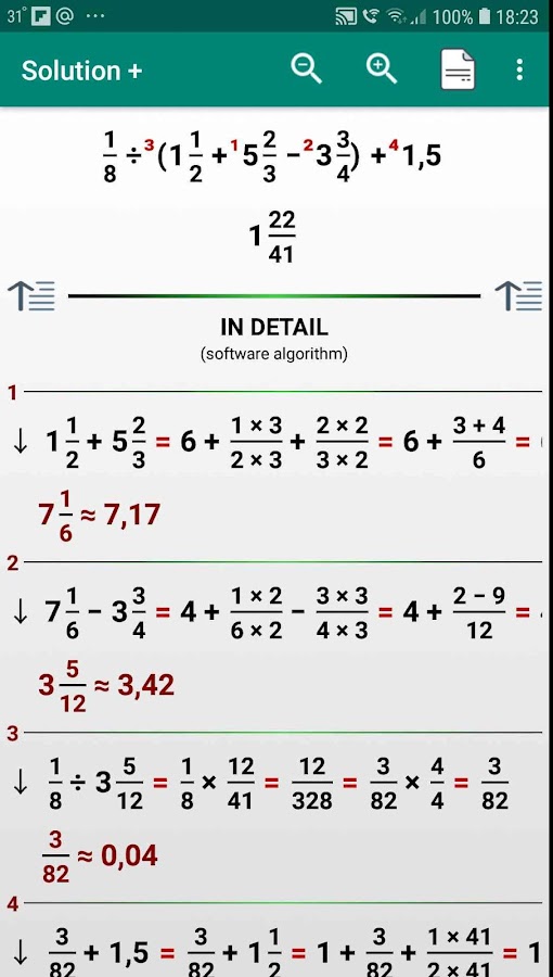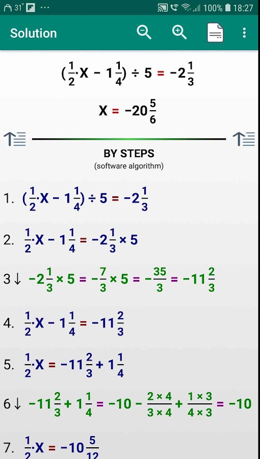 — показать краткий и подробный вариант решения одним из трех способов — в десятичных дробях с заданной точностью (как обычный калькулятор), в обыкновенных дробях или смешанных числах;