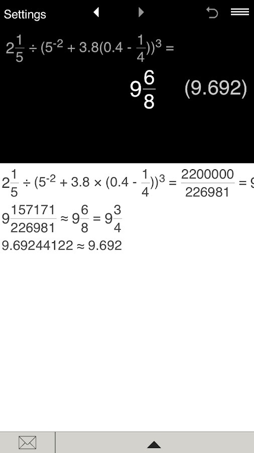 • Результаты вычислений показываются в дробном и десятичном виде.