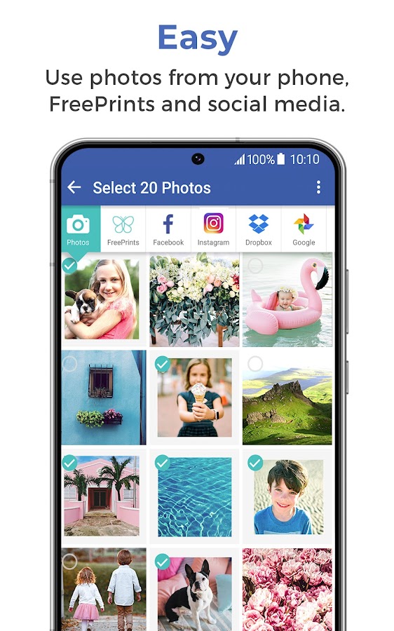 ★ Добавляйте фотографии практически откуда угодно — с вашего устройства или из таких источников, как Facebook, Dropbox и предыдущие заказы FreePrints™.
