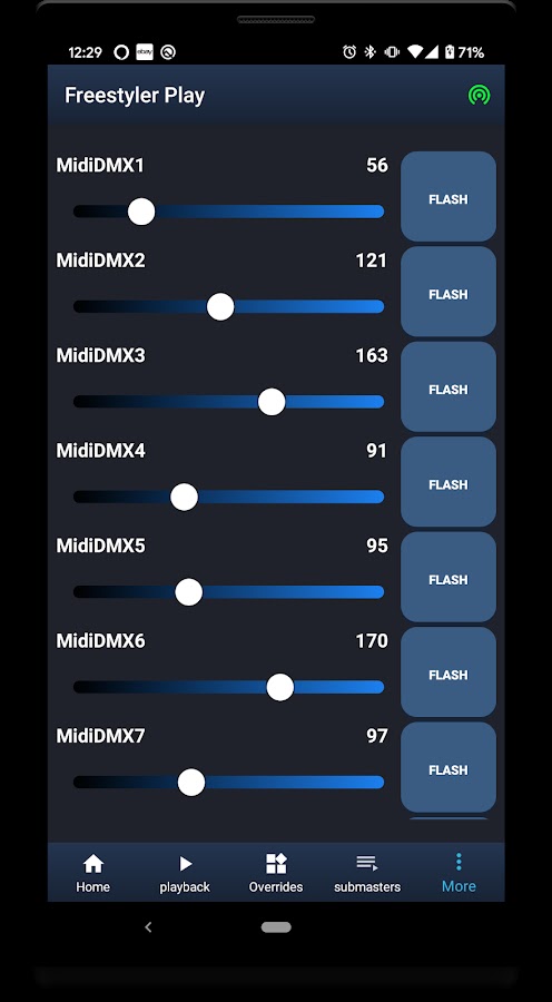 Фейдеры DMX (24 прямого доступа к DMX) настраиваются в FS MIDI2DMX