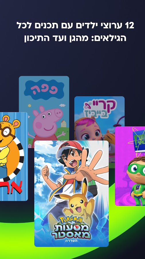 Присоединяйтесь с легкостью и смотрите все израильские вещательные каналы, лучшие спортивные каналы, множество детских каналов, широкий спектр развлекательных каналов и большую библиотеку VOD израильских и зарубежных фильмов и сериалов.