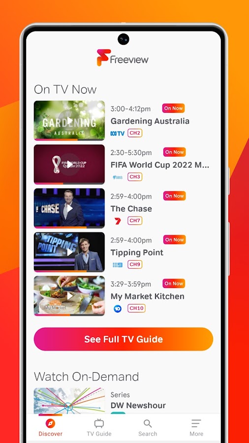 С Freeview вы можете смотреть, искать и узнавать о телепрограммах, которые нельзя пропустить, на каналах ABC, SBS, 7, 9 и 10. Freeview позволяет быстро и легко искать весь невероятный контент, доступный в прямом эфире и по запросу на более чем 30 каналах. Все в одном месте. Все БЕСПЛАТНО!