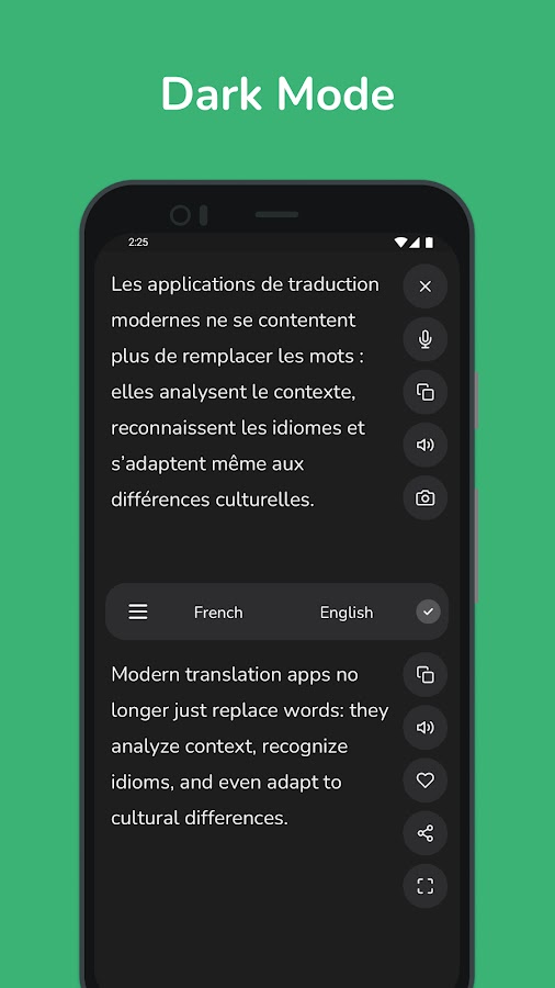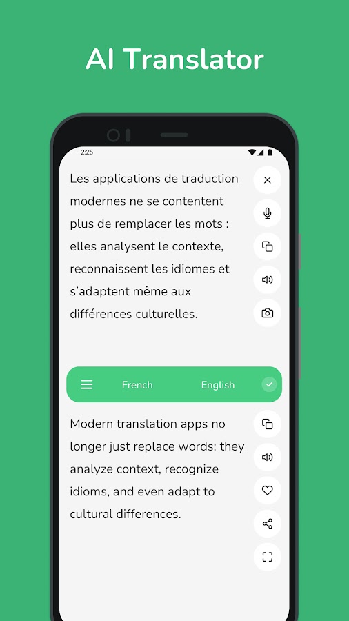 • Мгновенный перевод: получайте быстрые и точные переводы с французского на английский и наоборот, идеально подходящие для повседневного использования.