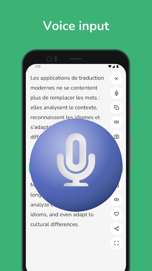 • Распознавание голоса: говорите прямо в приложении, и наш искусственный интеллект мгновенно переведет вашу речь, делая разговор более плавным.