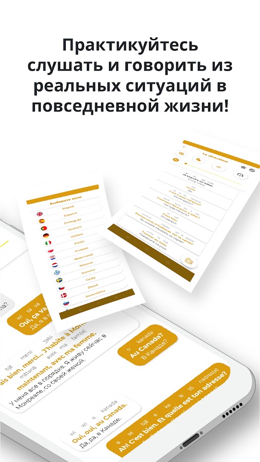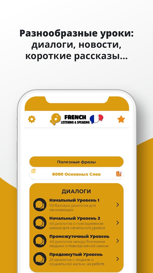 «Учить Французский — Слушать И Говорить» одно из развивающихся приложений PORO для самообучающихся, которые хотят легко и эффективно общаться на французском языке. 750 ежедневных диалогов, список уроков с различной тематикой от поздравления, совершения покупок, работы, семейного разговора … Подходит для всех изучающих французский язык − от начинающего до среднего и продвинутого, чтобы практиковаться в общении на французском языке.