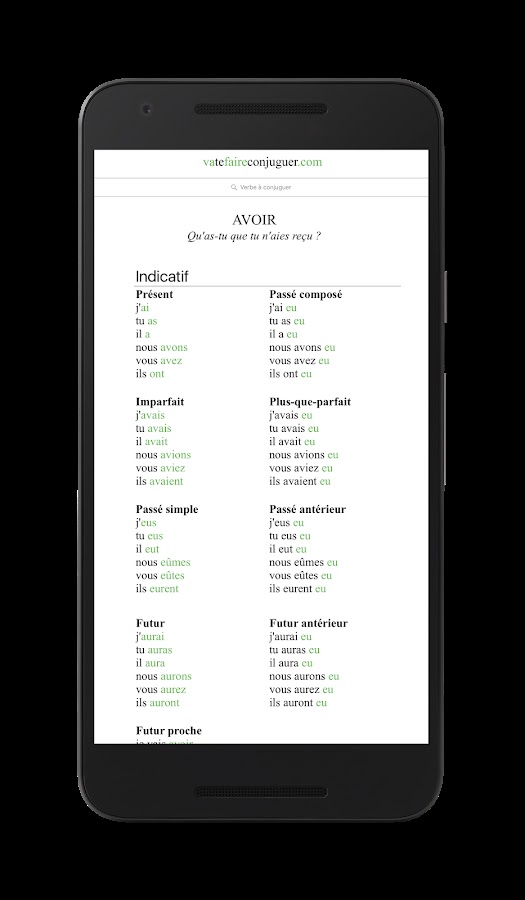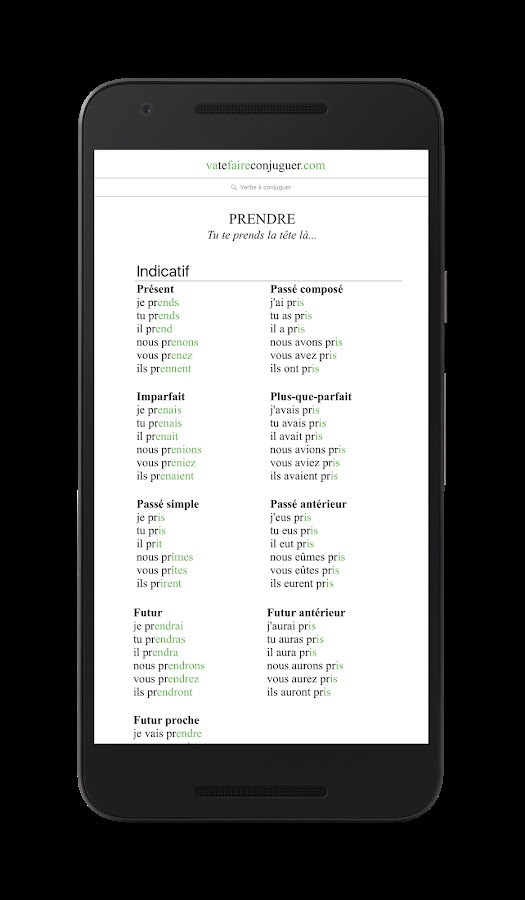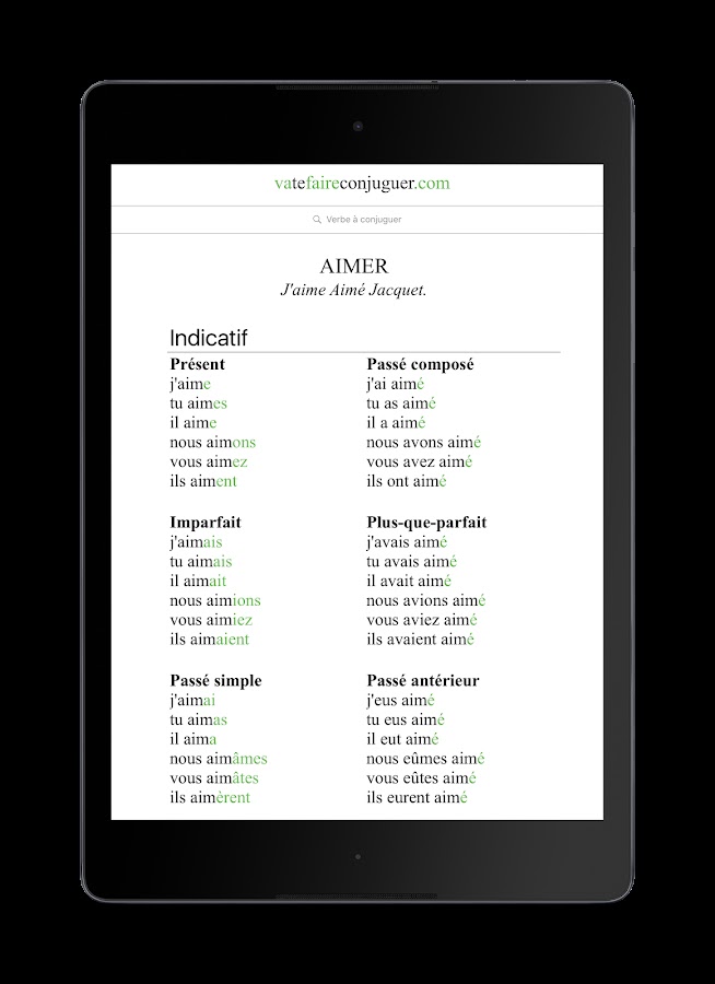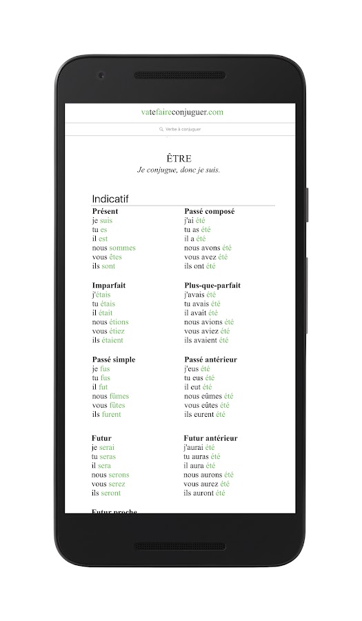 Благодаря этому приложению для мобильного телефона вы сможете легко спрягать французские глаголы. Если вы сомневаетесь в том, как спрягается тот или иной французский глагол (быть, иметь, идти, делать и т.д.), просто введите его в поле поиска, нажмите на ввод, и приложение выдаст вам формы спряжения во всех временах, включая сослагательное и повелительное наклонение.
