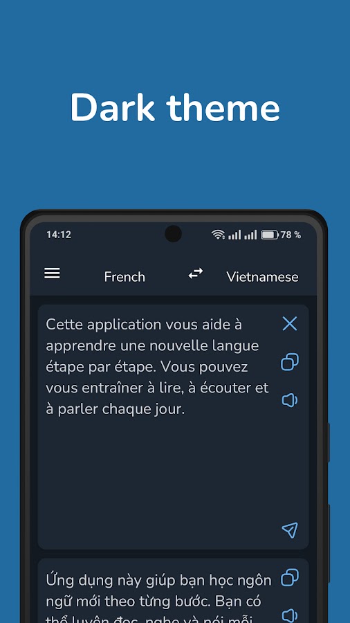 Переводчик с французского на вьетнамский — быстро, конфиденциально, офлайн. Теперь с темным режимом!