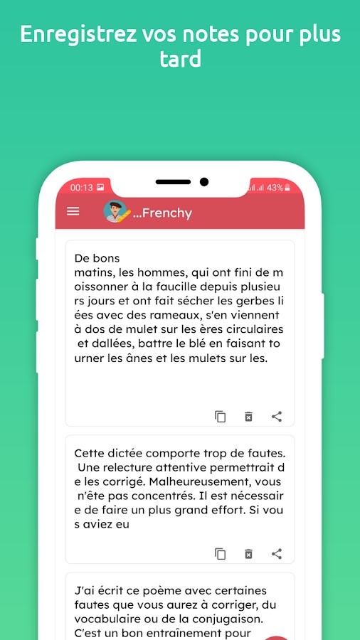 Мгновенно улучшите свои навыки письма на французском языке с помощью Frenchy, простого в использовании приложения для написания текстов без ошибок. Идеально подходит для вашей электронной почты, социальных сетей и профессионального общения. Frenchy исправляет ваши орфографические и грамматические ошибки в мгновение ока.